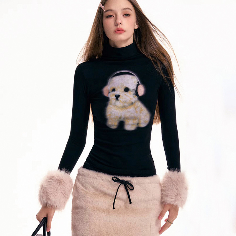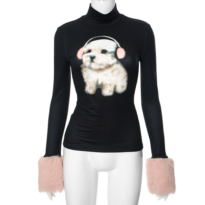 Puppy Print Semi-turtle Neck Long Sleeve T-shirt Women&